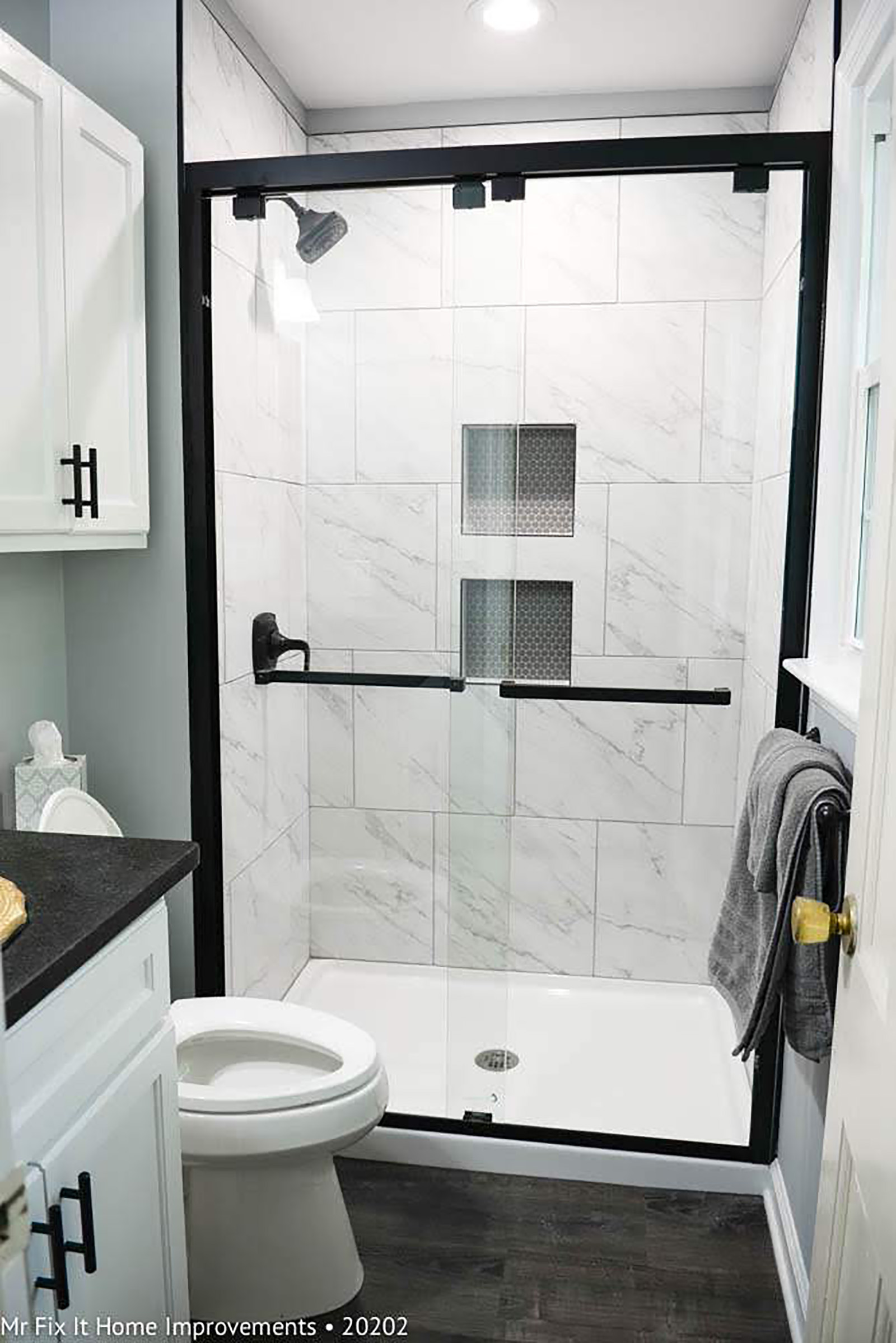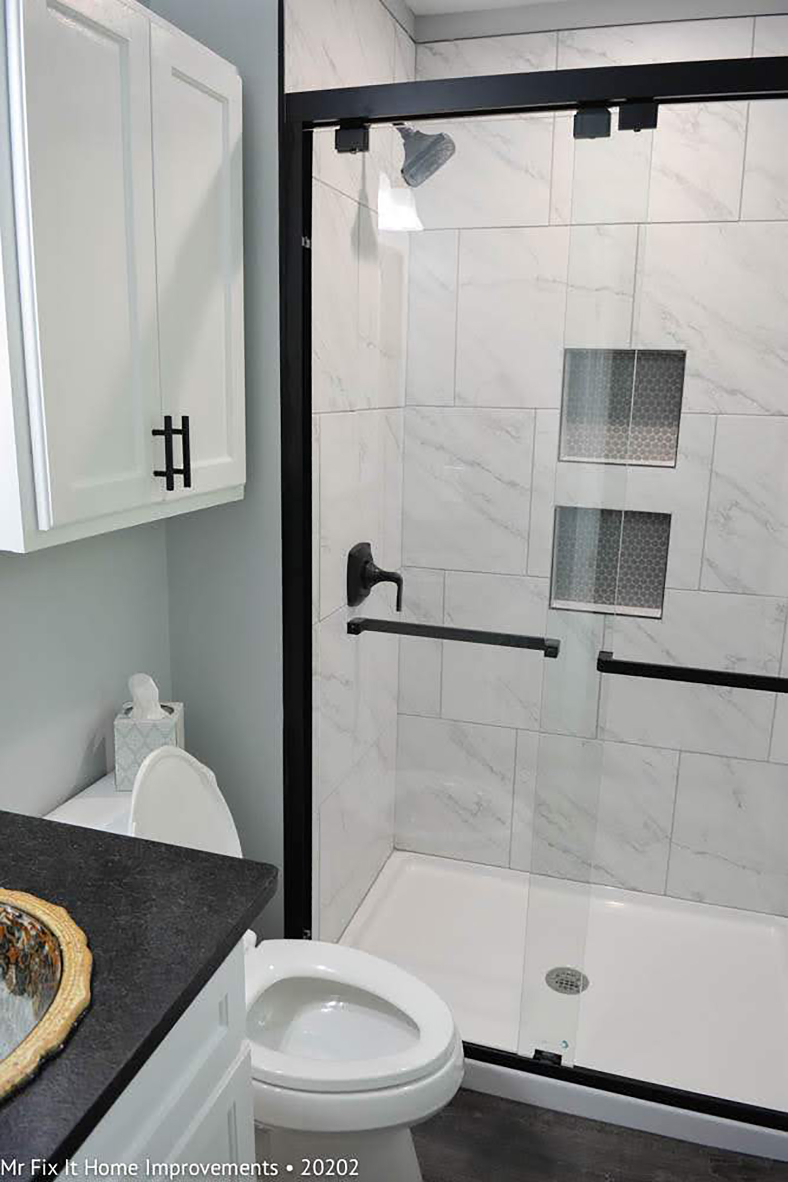 This new bathroom restoration was a complete demolition down to the stud walls. Once finished, this home has a spacious modern bathroom with black accents and many years of access and functionality.