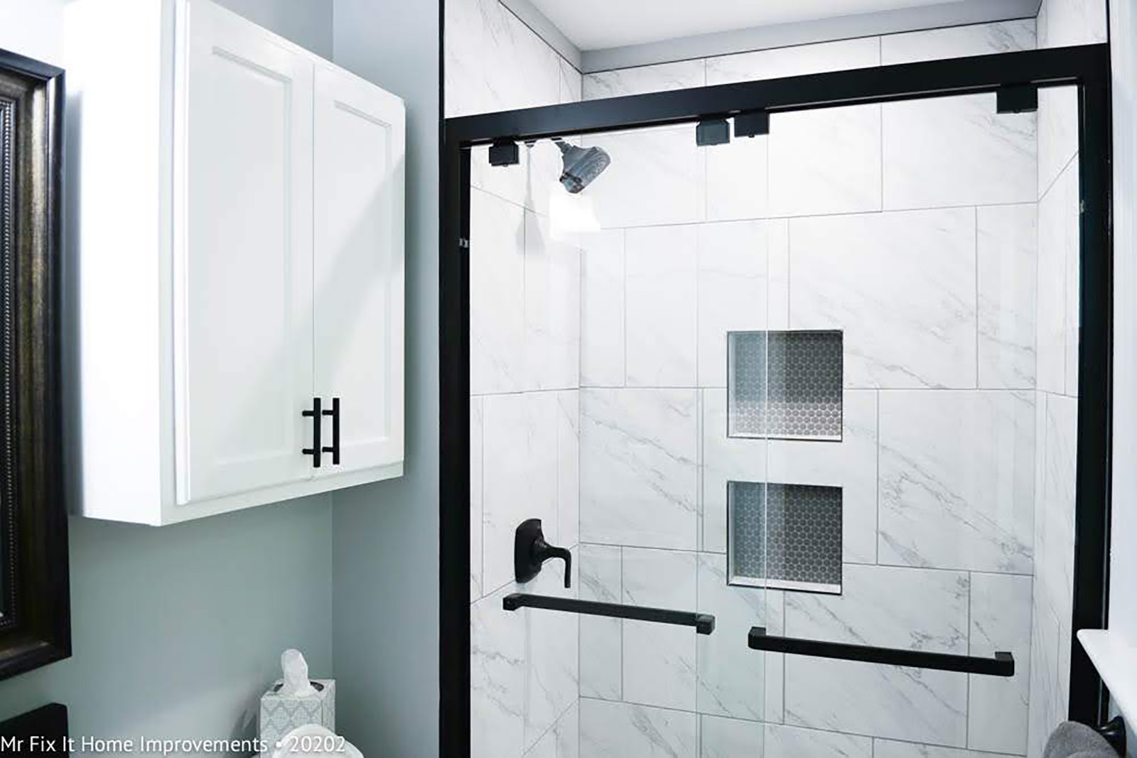 We began by installing a new finish over green board sheetrock. Then we primed and painted the ceiling walls. Once that was set, a 60"x30" acrylic shower base. Building out a new custom shower, we applied 18" x 18" tile on the shower walls with 12" mosaic backing and two-wall niches. Our craftsmen also installed a stunning black Dreamline semi-frameless sliding shower door with a black Kohler faucet and a black sink faucet.