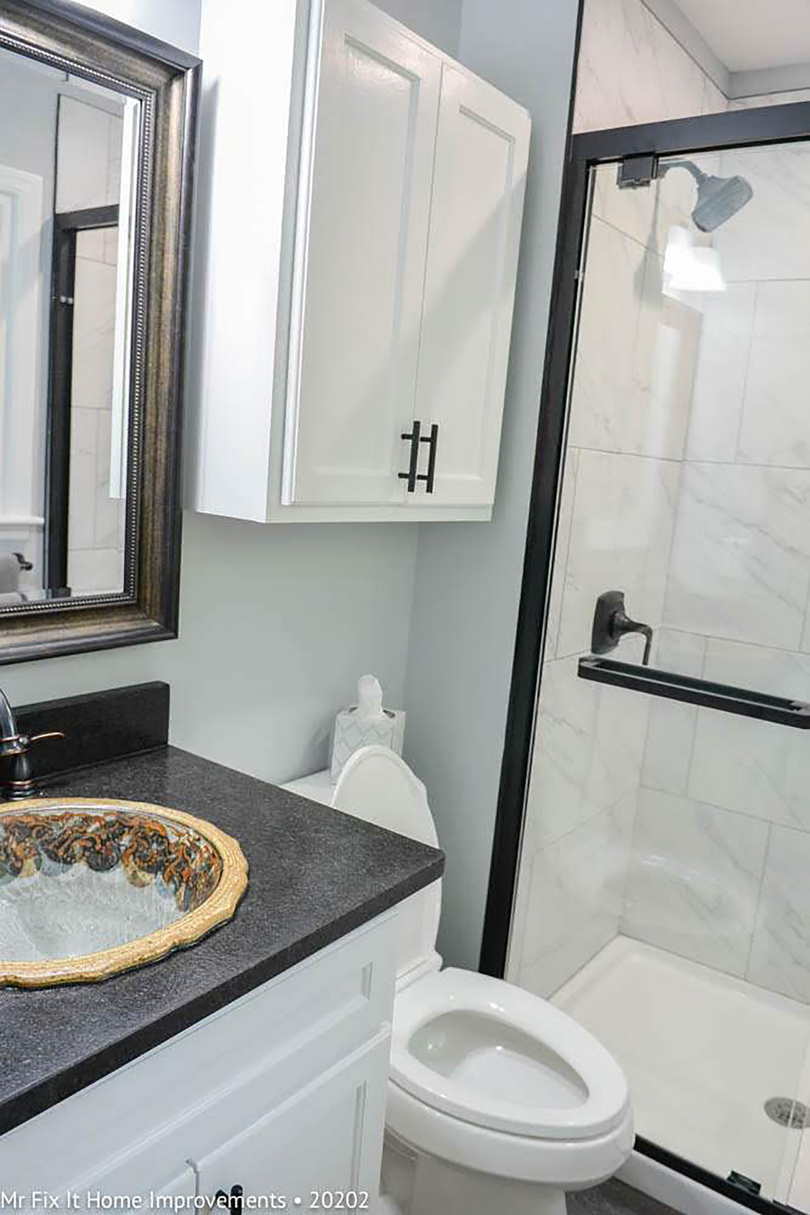Outside of the shower, we installed a 27" custom-made vanity cabinet, plus storage over the commode. There are also two new coats of fresh paint on the cabinetry.