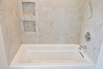 The new bath is a Kohler 60' x 32' Archer series tub with 12"x12" wall tile on a brick pattern with brushed nickel water fixtures for a modern and functional design.