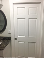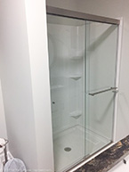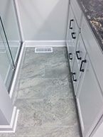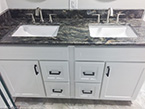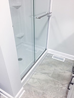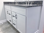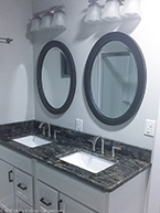Here's a small bedroom that was converted into a modern new bath. This tiny bedroom was converted into an elegant bath with custom-made 33" dual solid wood vanities with 8" spread Moen sink faucets. Granite countertops and a 48" x 34" Kohler four-piece shower unit.