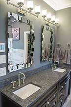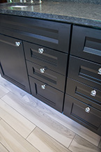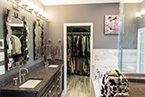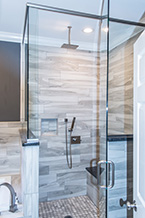 The walk-in shower is a 60x40 glass enclosure with custom Kohl faucets including a handheld unit hear the tiled bench. This open bathroom features black Craftmade cabinetry with granite counter tops and we even made it bigger by reducing a couple of feet from a walk-in closet.