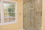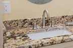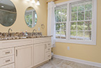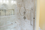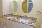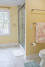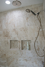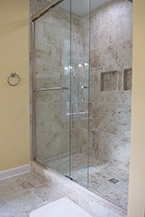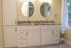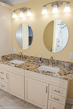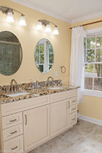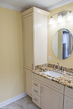 From there, we laid down solid porcelain 12" x 24" tile and built a new walk-in shower with 12" x 12" wall tile with a matching brick pattern. On the floor are 4 1/4" baseboards. The centerpiece is a Normandy Color Granite countertop on top of Kraftmaid solid wood cabinetry accented by a linen closet.