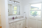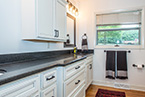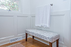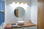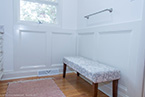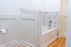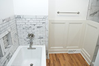 The entire room is accented by elegant wainscotting on each wall. The second full has black matte granite countertops and a Kohler Archer Biscuit finish tub. The half bath was finished with a stunning butcher-block counter with a white vessel bowl with Delta bright brass single pole faucet and accessories and as a final touch an Orleans mosaic floor tile.