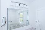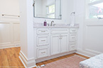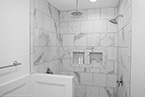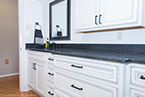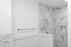 We started with Diamond Prelude solid wood cabinetry throughout with a coconut color with grey stone glaze. In the master bath, we installed a stunning quartz countertop in Santiago finish. The centerpiece is a grey stone porcelain shower with matching mosaic tile on the tub walls.