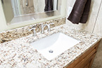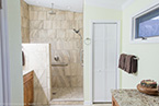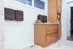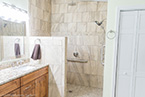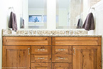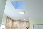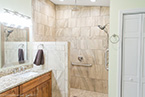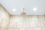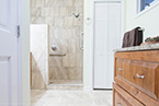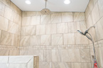 We enjoyed working with the client to create a custom linen closet and base cabinet too. The spacious shower has complementary Atlantis floor tile and a rain-head shower unit. To accent the lighting, we also lowered the ceiling and brought the skylight more into view and designed crown molding throughout to set off the final touch.