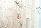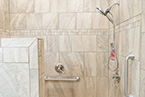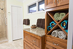 The detail and quality are accented by plywood construction using Kraftmade birch cabinetry with extraordinary wood grains in the finish. This all sits on top of full body porcelain Atlantis tile for both the floors and wall in an almond bardolino color.