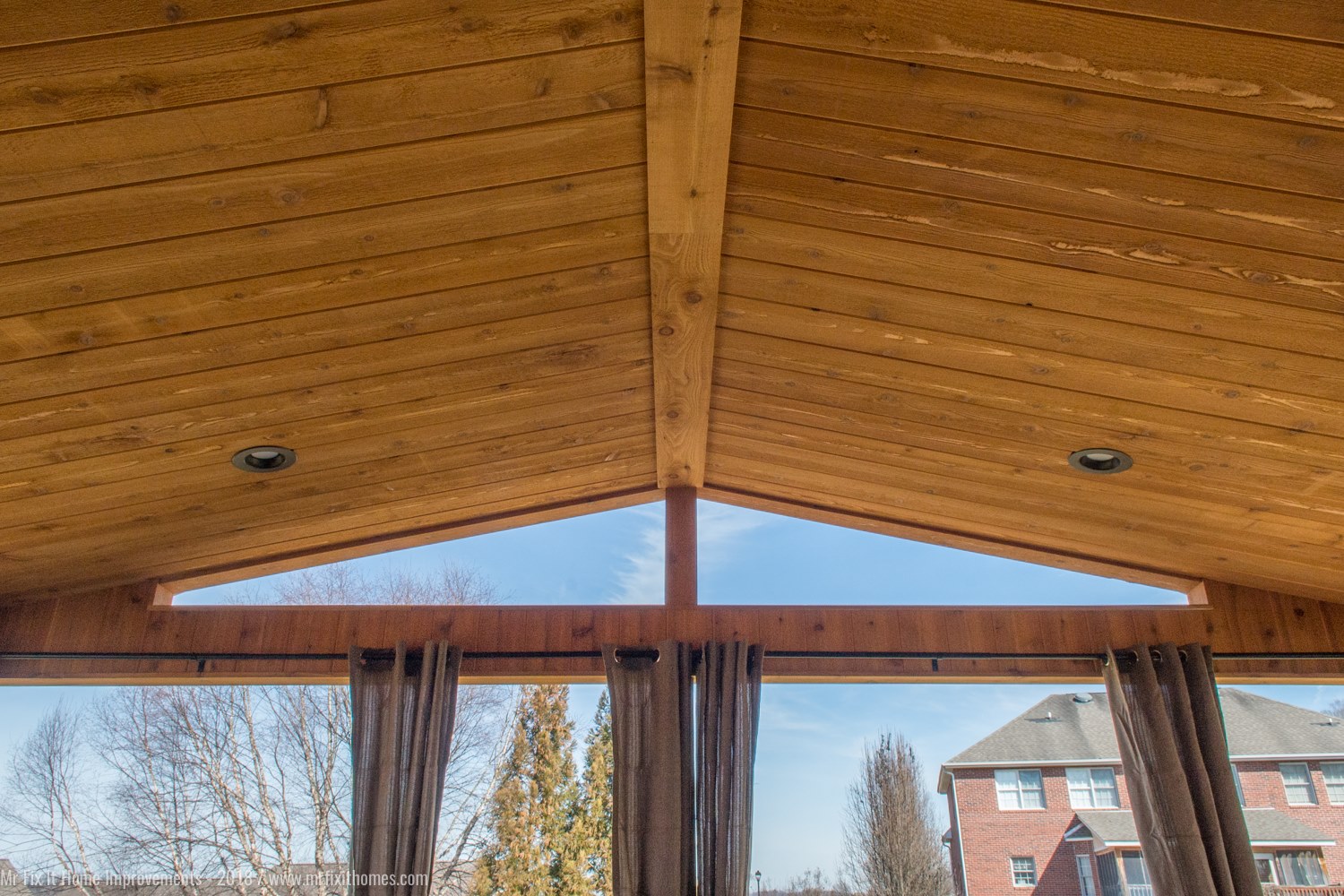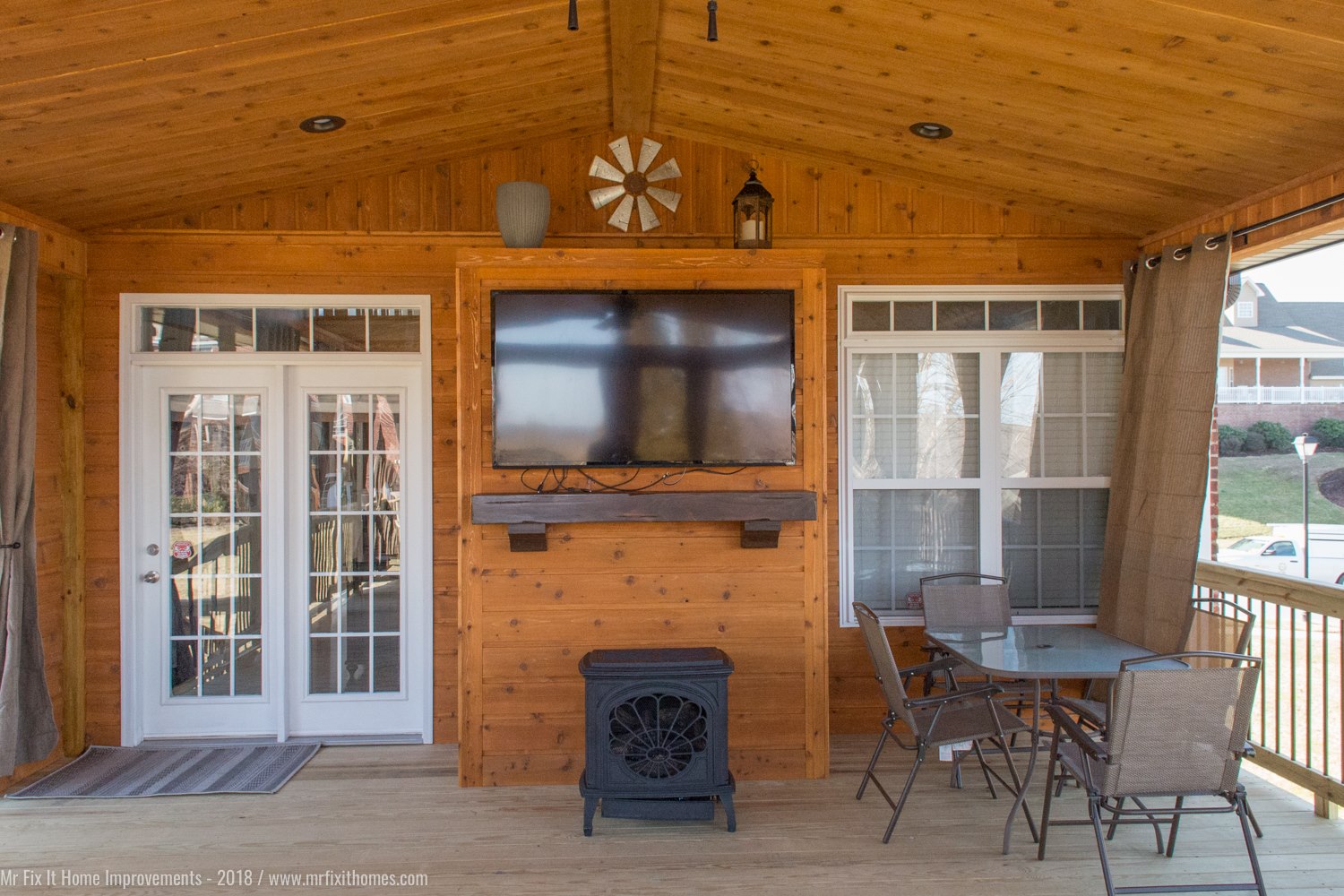 We also removed vinyl siding and installed channel rustic wood on the main house wail and continued the interior by buildout out a 1″x8″ tongue and groove continuous cedar ceiling. There’s even an open gable on the roof with a cedar finish and nice mount and outset for a big-screen tv for those nights in the hot tub.