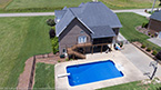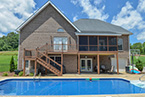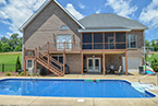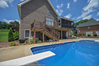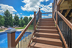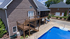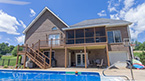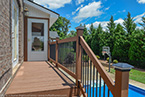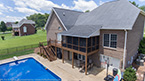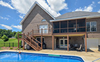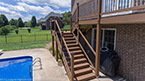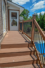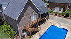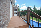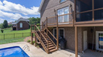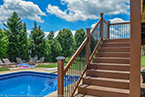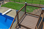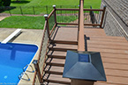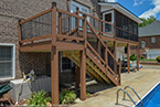 The landing from the pool to the screen room is 14' x 4' with two sets of 4' steps. The framing is dry-treated for long wear outside and has step treads and step risers. As a final touch, we installed black aluminium balusters encased with stained rail framing and knee walls all around.