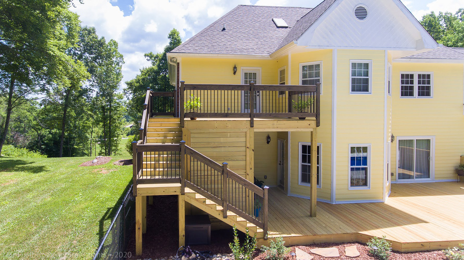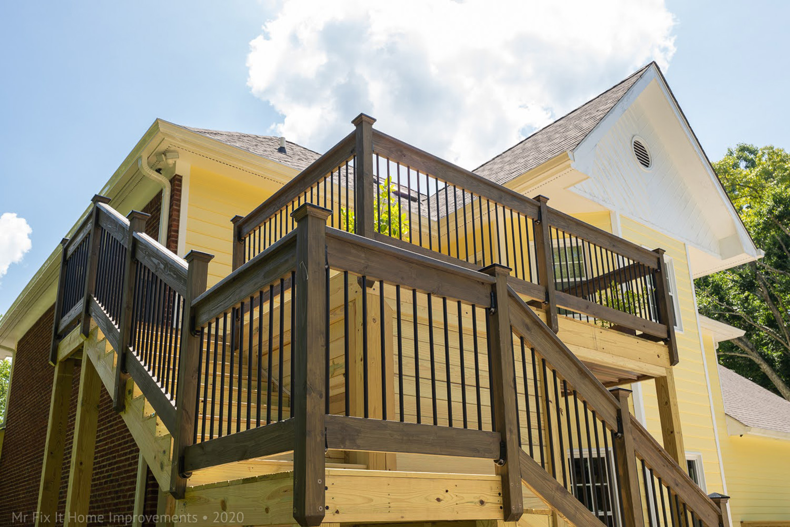 Below, there are two privacy walls support with a 6 "x6" post and 2x4 framing with kiln-dried wood that's sturdy and quiet. An added feature of this deck is the aluminum roof panels under the base of the top-floor joist sloped for water drainage so that water does down the 6" drain spouts and away from the private space underneath.