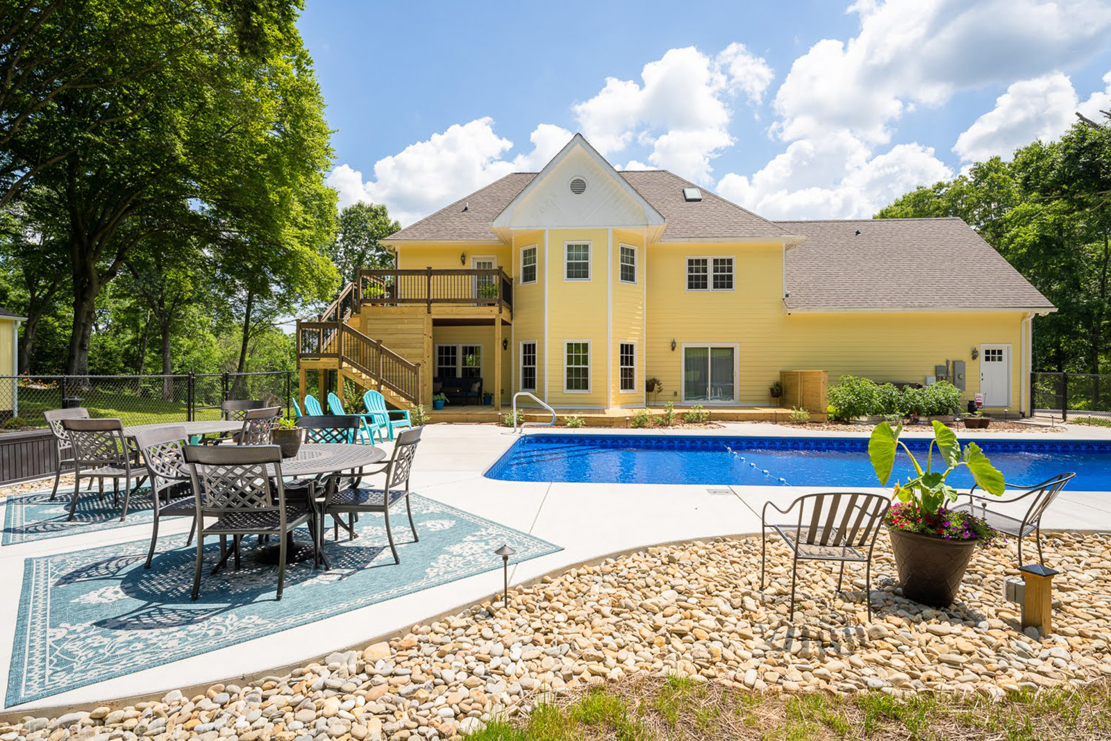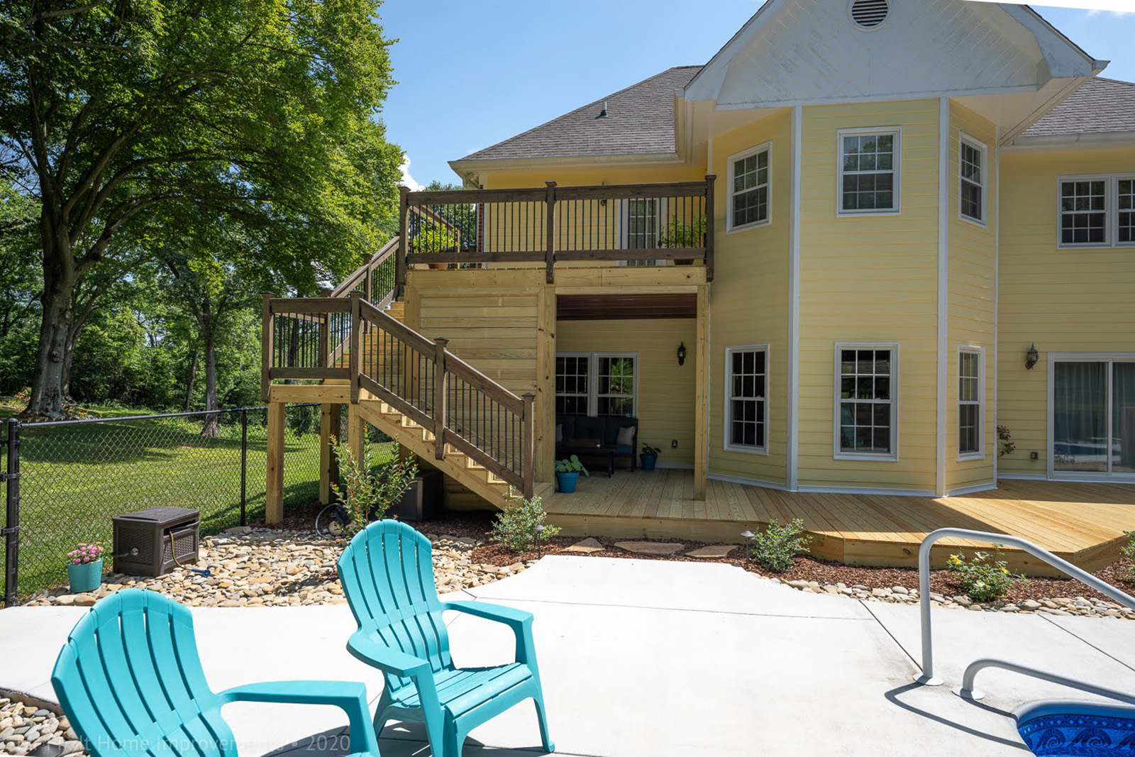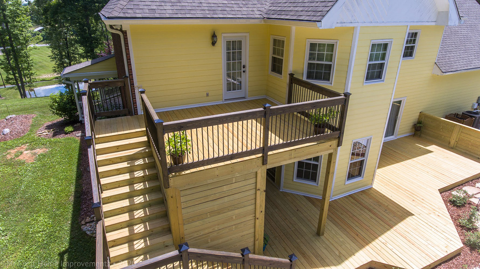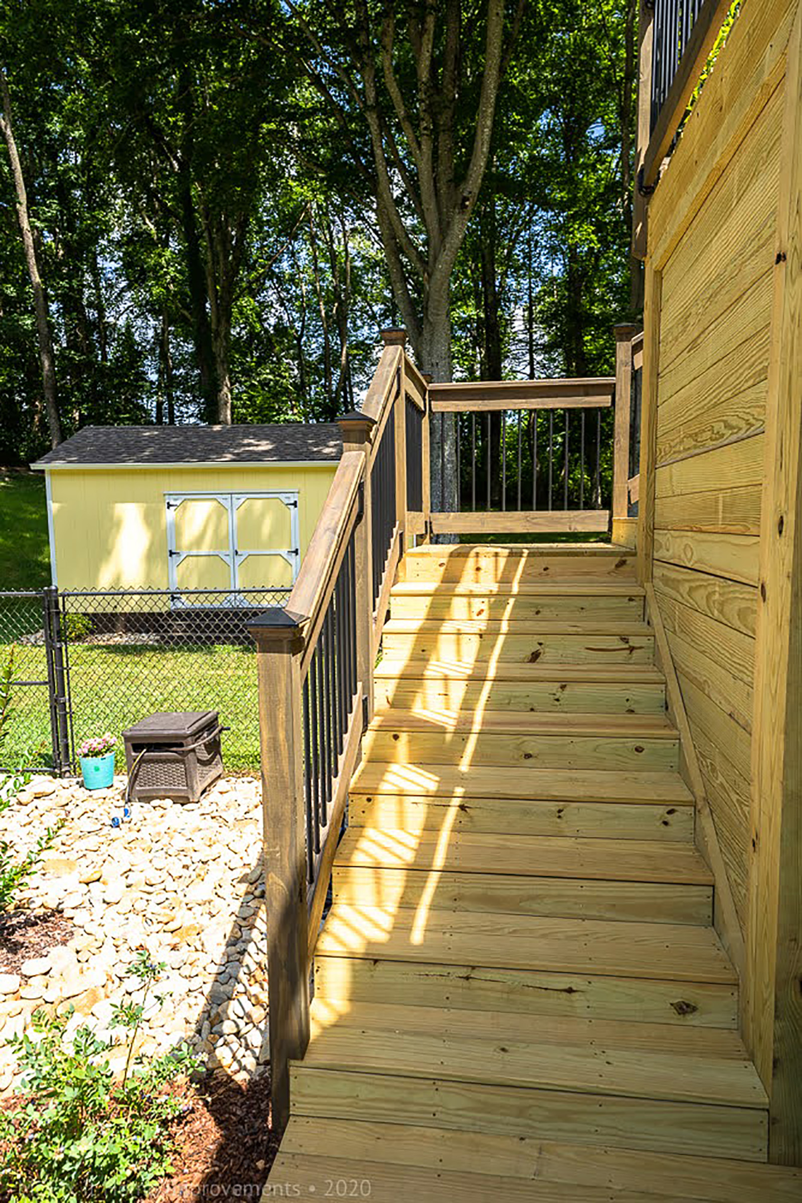 There are two sets of stairs separated along the way with a 4'x'4 landing before giving way to a 16x12 second level deck overlooking the backyard pool. Along the way are black balusters, matching handrails and step backing on the stairs. This home in Harmony, TN, has two sets of stairs that lead to an upper level 16' x 12' second level with black balusters as part of the railing. There's a 4'x4' landing along the way and includes step backing and matching handrails.