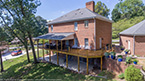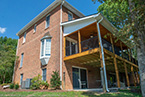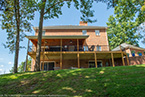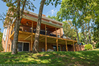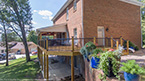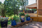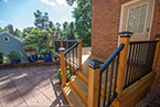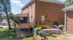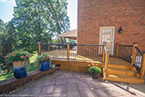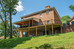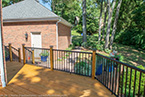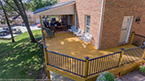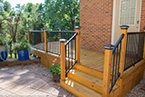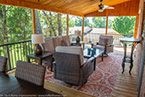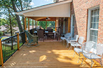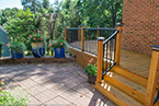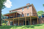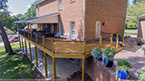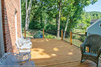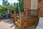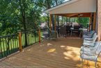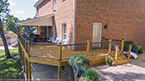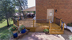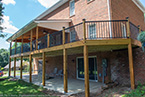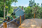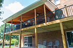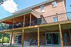 Outside of the porch, the deck is an open design and wraps around to an exterior entrance. It's covered from top to bottom with two coats of TWP wood sealer and accented by Afco aluminum black railings between all posts and step railings.